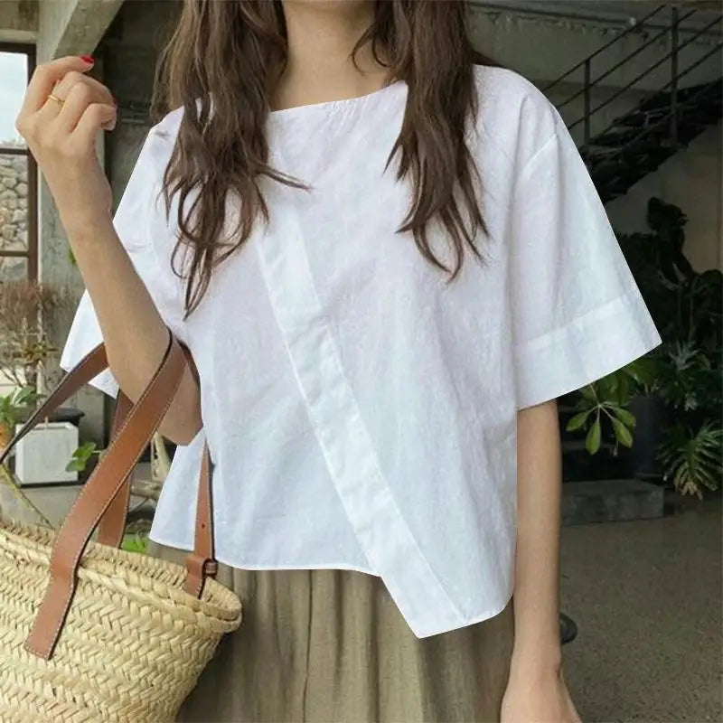 Elevate your everyday look with this white asymmetrical crop top. Designed with a modern boxy silhouette and square neckline, this lightweight women's blouse is made from 100% polyester for a breathable, easy-care finish. Perfect for pairing with high-waisted jeans, trousers, or skirts, it blends minimalist style with versatile comfort.